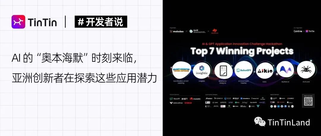入围决赛的 7 个项目涉及开发工具、金融监管、教育、消费、创意领域,获奖情况可见《AI&GPT 黑客松决赛跨空间联动, 共同揭秘终极大奖》。未来 AI 将如何潜移默化地改善我们的工作和生活?TinTinLand 深入获奖项目产品细节,与各个团队探讨他们是如何思考,并将想法付诸行动。