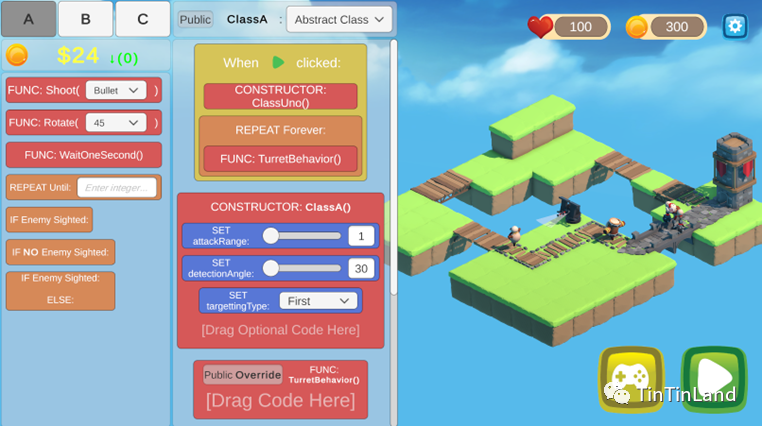 在代码模式下,学生能够利用自定义的面向对象的块编程接口来编写塔防游戏的炮塔。这是一个无风险、无成本的环境,使学生能够可视化代码的输出,并鼓励积极尝试面向对象编程。