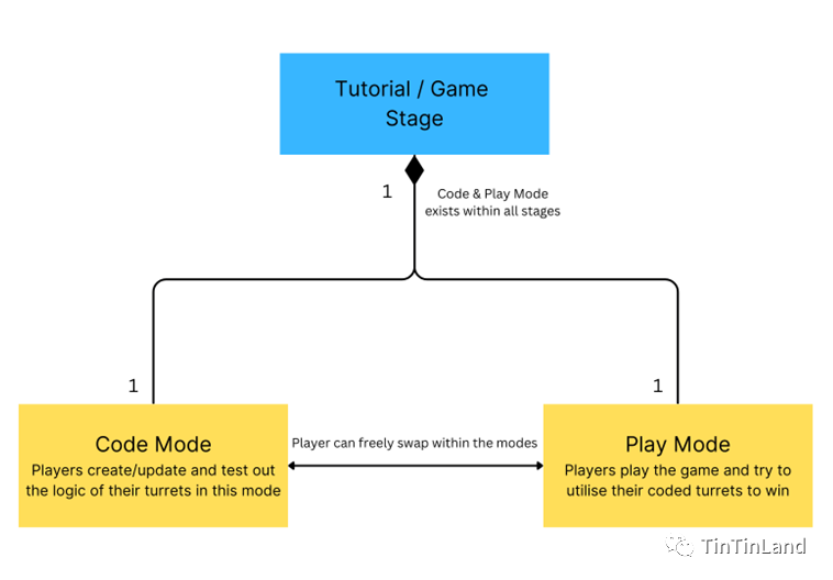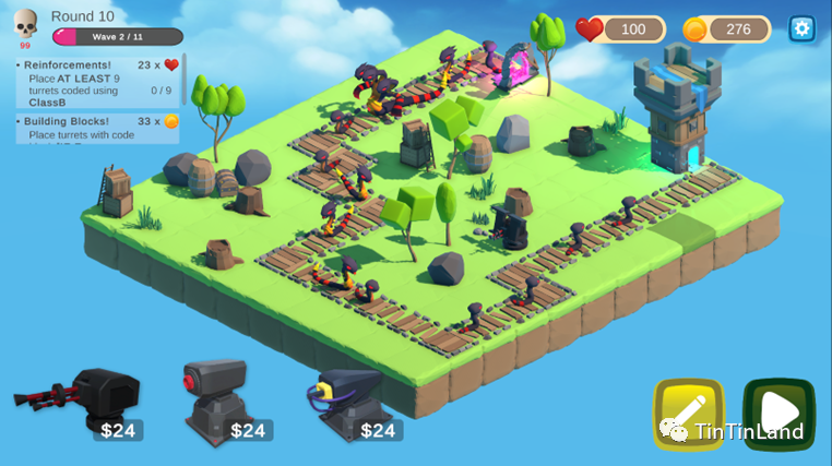 深入到玩法,“面向对象的塔防”中的每个阶段都包含两种游戏模式:代码模式和游戏模式。