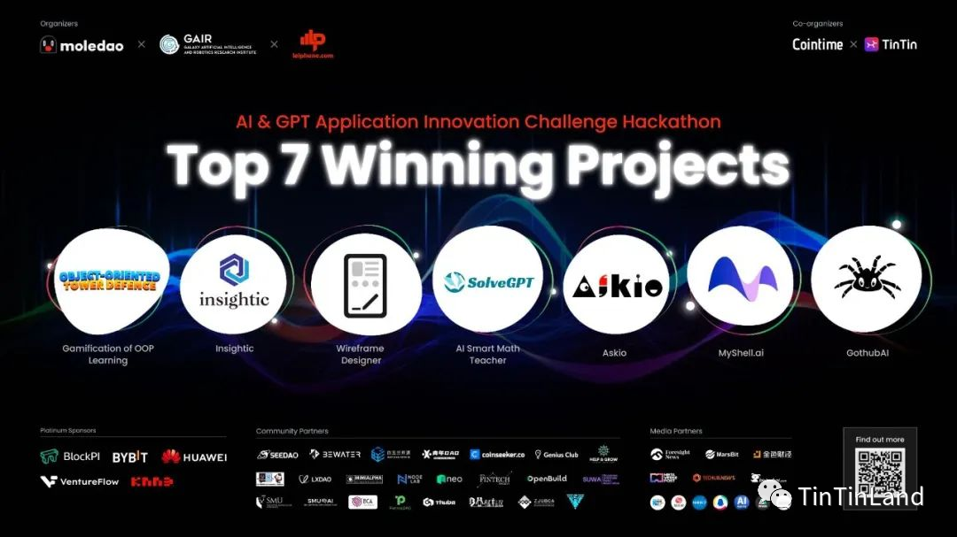 应用开发正是亚洲创新者的擅长领域。就在上个月,由 Moledao、雷锋网、GAIR 主办,TinTinLand 和 Cointime 联合主办了一场以 AI & GPT 为主题的 Hackathon,旨在促进创新、交流和合作,探索 AI & GPT 技术在各个领域的应用潜力。本次黑客松吸引了各领域的创意者、开发者和技术狂热者,共计 57 个项目报名参与,经过 12 位行业知名评委评估,总计 11 个优质项目入围,最后在第二轮线上路演筛选后,共 7 个项目入选 8 月 15 日于新加坡 Orchard Hotel 举办的决赛。