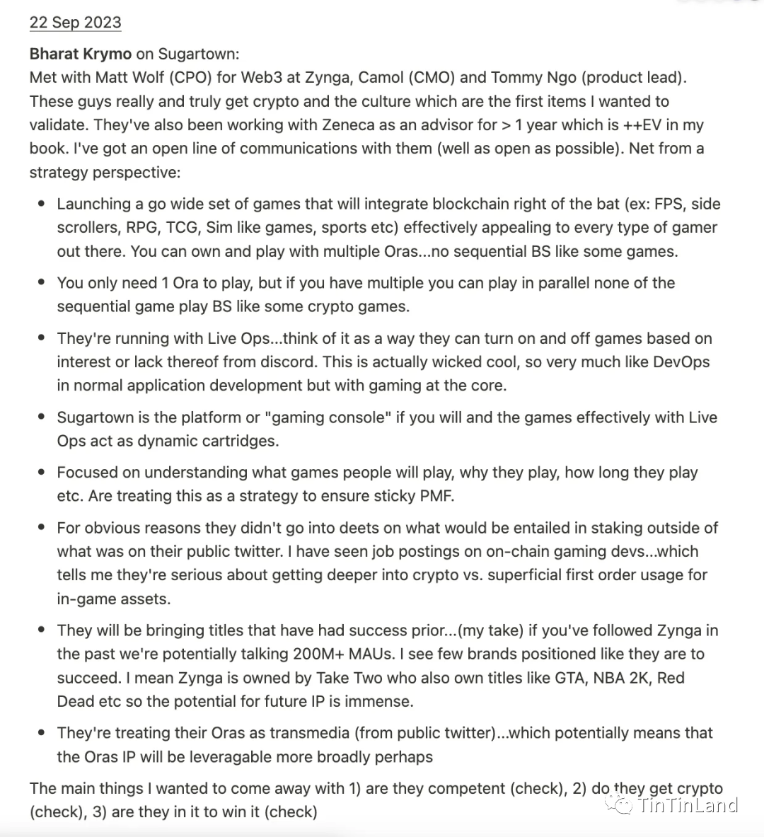 与 Zynga 的 Web3 首席产品官 Matt Wolf、首席市场官 Camol 和产品主管 Tommy Ngo 会面。他们真正了解加密货币和文化,这是我首先想说明的。他们还作为 Zeneca 的顾问合作了一年多,这对于我的书非常有价值。我与他们保持了密切的沟通。从战略角度来看: