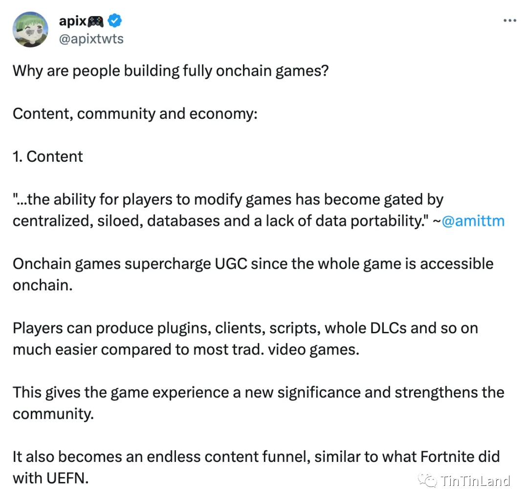 全链游戏强化了用户生成内容(UGC),因为整个游戏都可以在链上访问。与大多数传统视频游戏相比,玩家可以更轻松地制作插件、客户端、脚本、整个 DLC 等等。这赋予了新的游戏体验意义并增强了社区性,这也变成了一个无穷无尽的内容渠道,类似于《堡垒之夜》(Fortnite) 对 UEFN(堡垒之夜虚幻引擎编辑器)所做的事情。