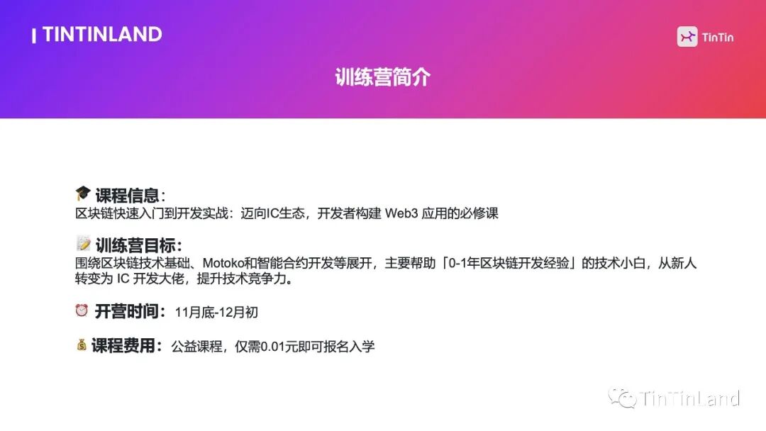 本期训练营围绕区块链技术基础以及 Motoko 和智能合约开发等方面,帮助「0-1年区块链开发经验」的技术小白从新人转变为 IC 开发大佬,提升技术竞争力。如果你错过了本次宣讲会,快来查收 TinTinLand 为你准备的宣讲会精华回顾吧!