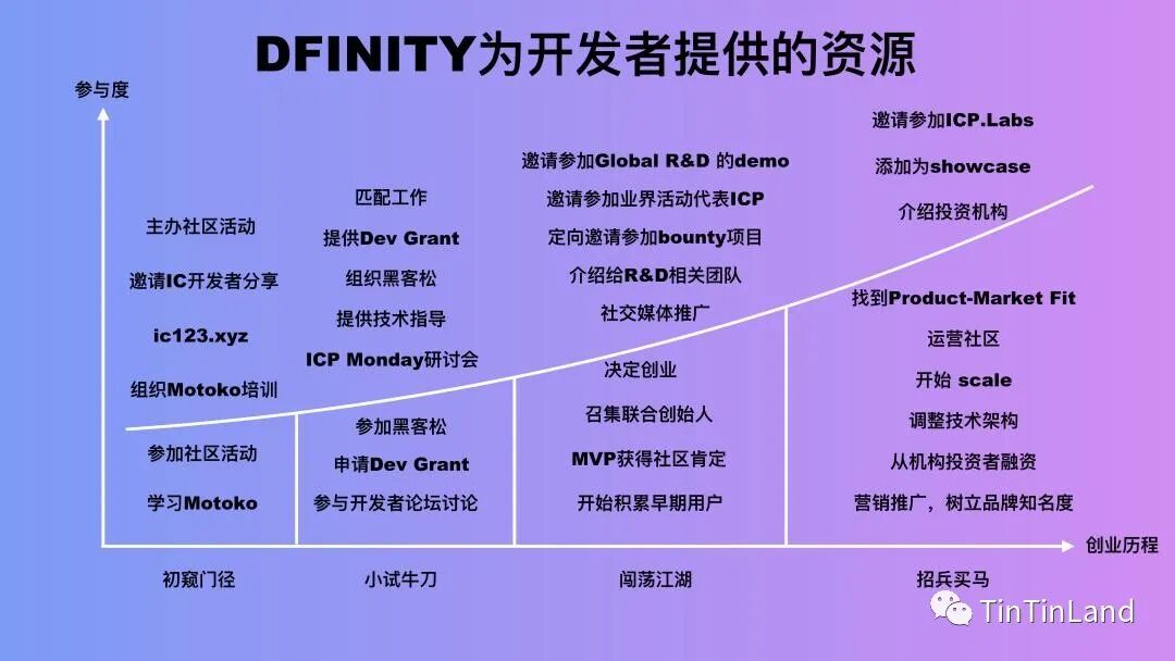 IC 生态还为开发者提供了多种支持资源。从学习阶段到实际项目的开发,IC 生态都为开发者提供了丰富的支持。开发者可参加活动、黑客松,并申请开发者 Grant,而 IC 基金会也会对部分优秀的开发者进行资助。随着项目发展,IC 还会提供加速营的机会,并为项目的进一步推广提供帮助。