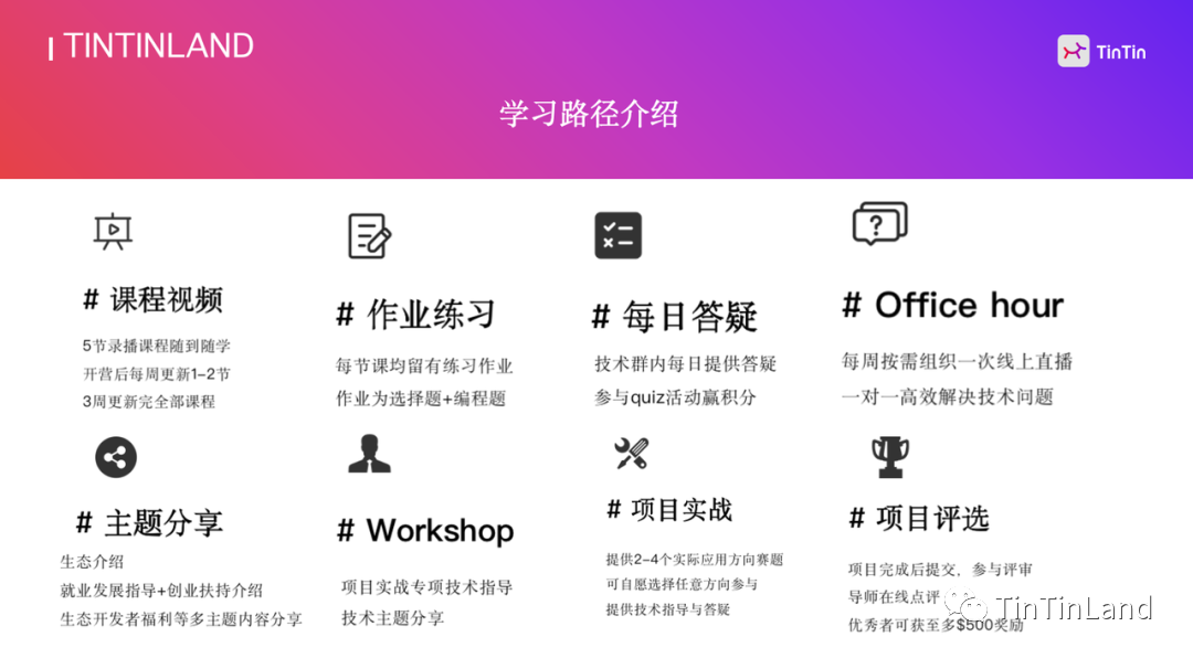 各位开发者完成课程费用支付后(仅需 0.01 元),需按照提示要求添加小 T 同学微信(微信号:TinTin-land)回复课程名称,课程班长会在 24 小时内通过好友申请后及时通知开发者入群学习。本期课程预计在 12 月初开班,课程开班后,您将享受课程相关的一系列服务,在线学习课程长期有效。