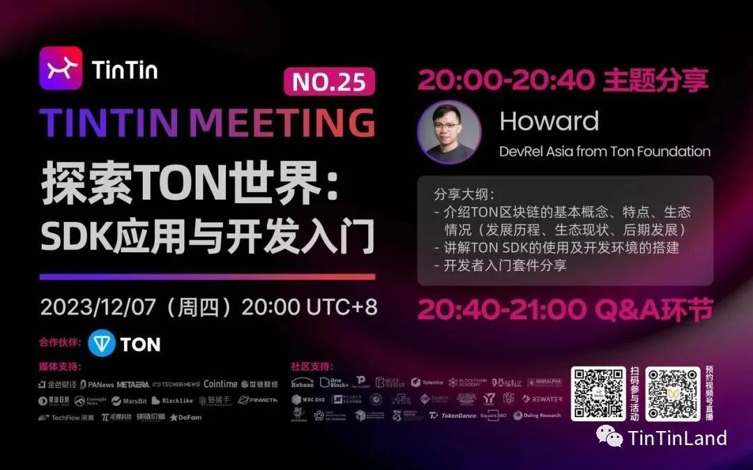 12 月 7 日晚 20:00 举行的第 25 期 TinTinMeeting 活动邀请到了 Ton Foundation 亚洲开发者关系成员 Howard 与关注 TON 生态发展的爱好者们相聚直播间,共同探索 TON 区块链的发展优势与 TON SDK 使用及开发环境的搭建路径。本次线上活动共吸引了近 1500 位观众的参与,不少观众还在直播间与嘉宾们近距离交流互动。