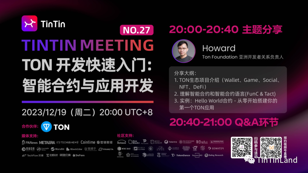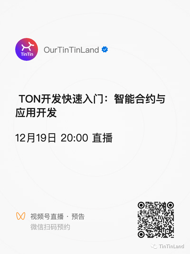 相信掌握 TON 区块链生态发展趋势与技术优势的你,有了更多利用 TON 进行智能合约部署与应用开发的兴趣!Ton Foundation 亚洲开发者关系成员 Howard 老师将继续为大家带来 TON 快速开发入门的知识干货分享。锁定 12 月 19 日(下周二)晚 20:00,第 27 期 TinTinMeetiing 将继续带领大家理解智能合约和智能合约(FunC&Tact),通过 Hello World 合约从 0 开始搭建第一个 TON 应用。