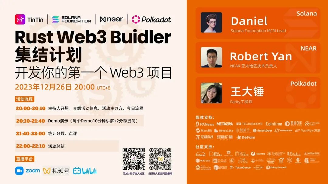 为了帮助开发者更好使用 Rust 语言、促进生态建设,Solana、Near、Polkadot 与 TinTinLand 开发者社区成为合作伙伴,共同推出了 Rust Web3 Buidler 集结计划——开发你的第一个 Web3 项目。本次 Rust 课程挑战赛也由 TinTinLand 联合 NEAR、Solana、Polkadot 共同主办,旨在为 Rust 入门第二期课程的学员和助教提供学习成果展示的平台。