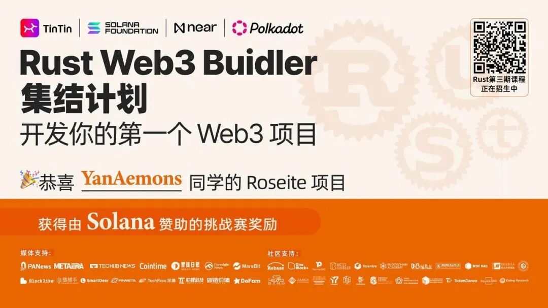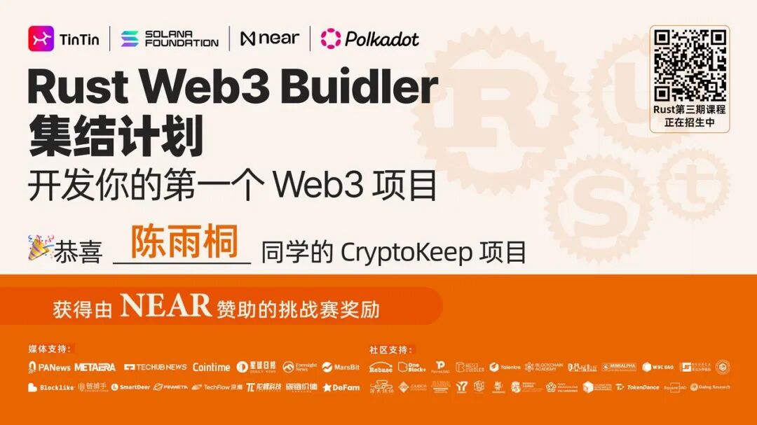 为了帮助开发者更好使用 Rust 语言、促进生态建设,Solana、Near、Polkadot 与 TinTinLand 开发者社区成为合作伙伴,共同推出了 Rust Web3 Buidler 集结计划——开发你的第一个 Web3 项目。本次 Rust 课程挑战赛也由 TinTinLand 联合 NEAR、Solana、Polkadot 共同主办,旨在为 Rust 入门第二期课程的学员和助教提供学习成果展示的平台。