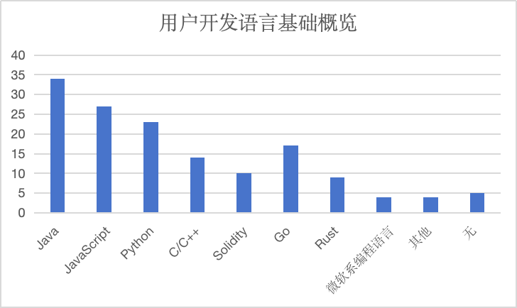 在用户开发语言基础统计中,拥有 Java、Javascript、Python、C/C++、Go、Solidity、Rust 开发经验开发者占大多数,其中约有 91% 左右的学员拥有实际开发经验,拥有 5 年以上开发经验的开发者占比约为 37%。