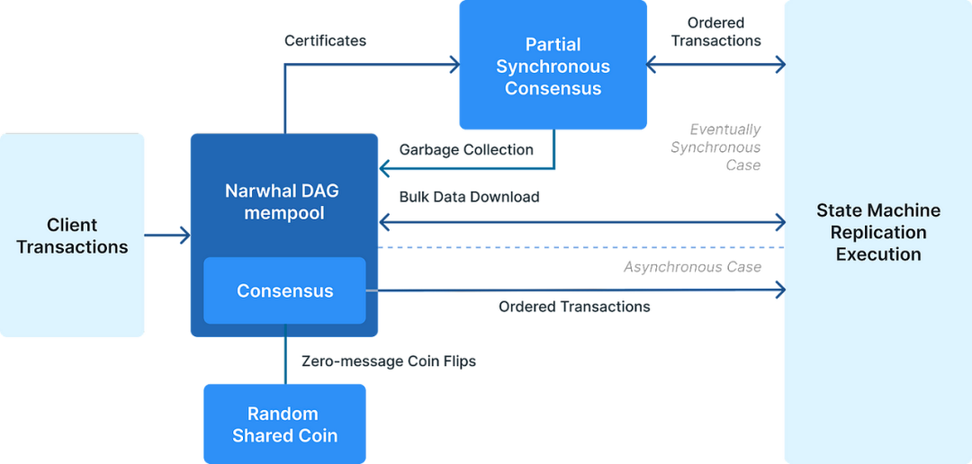 针对验证者能够实现并行处理的技术优势,在这背后有着 Sui Network 先进的排序和共识机制支撑。Sui Network 由基于 DAG 的拜占庭容错 Narwhal 和 Bullshark(Tusk)实现 DPoS,从而使其可以并行处理交易、快速达成共识,它将交易事务处理分为两种:独立的交易和具有从属关系的交易(独立的交易是没有因果关系的交易类型,采用拜占庭式一致广播达成共识;从属关系交易是指明确说明交易的从属关系来实现并行处理,主要是 Narwhal 和 Tusk 两种协议)。