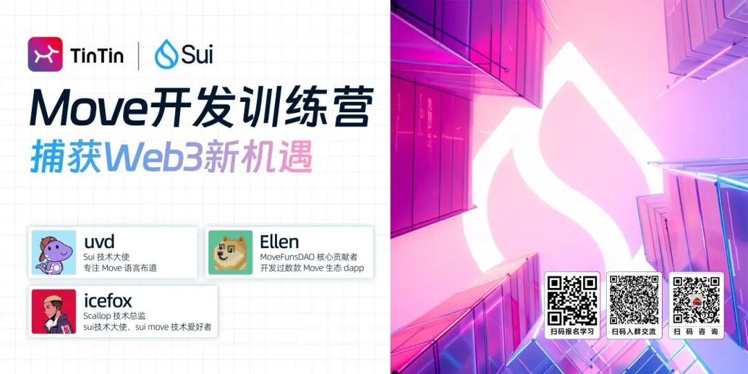 了解 Sui Move 的优越性能和开发体验后,你是否也对学习 Move 语言跃跃欲试?Sui 生态和 TinTinLand 携手举办的「Move 开发训练营」或许是你开启 Sui 生态开发探索的第一步的最佳选择!