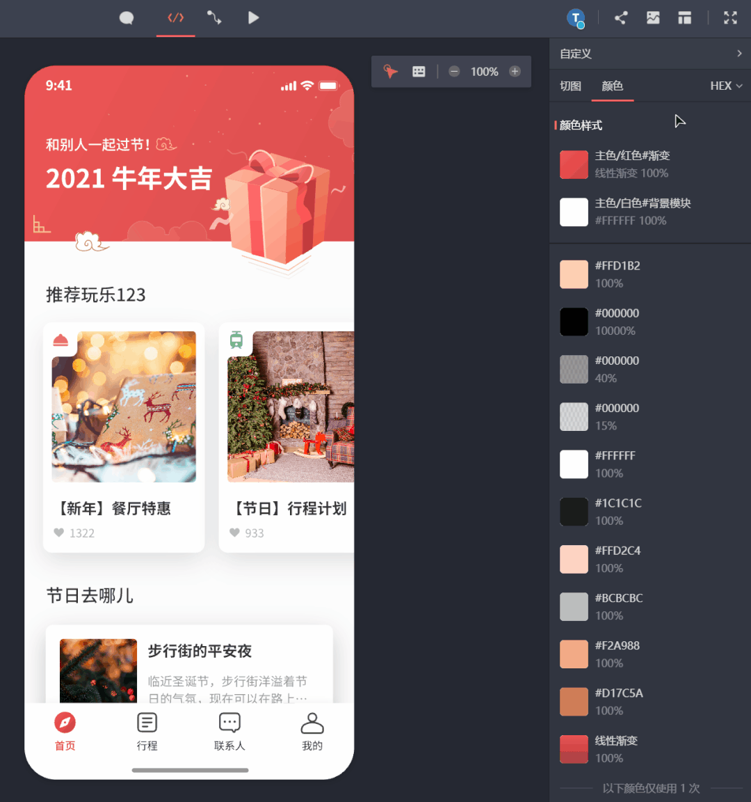 开发可以在新模式中一目了然地看到设计稿中使用的颜色和渐变效果,然后直接复制样式参数来快速搭建颜色库,方便后续调用,还能一键定位到所有使用了某颜色的位置,极大地提高了实现设计效果的效率和准确度。
