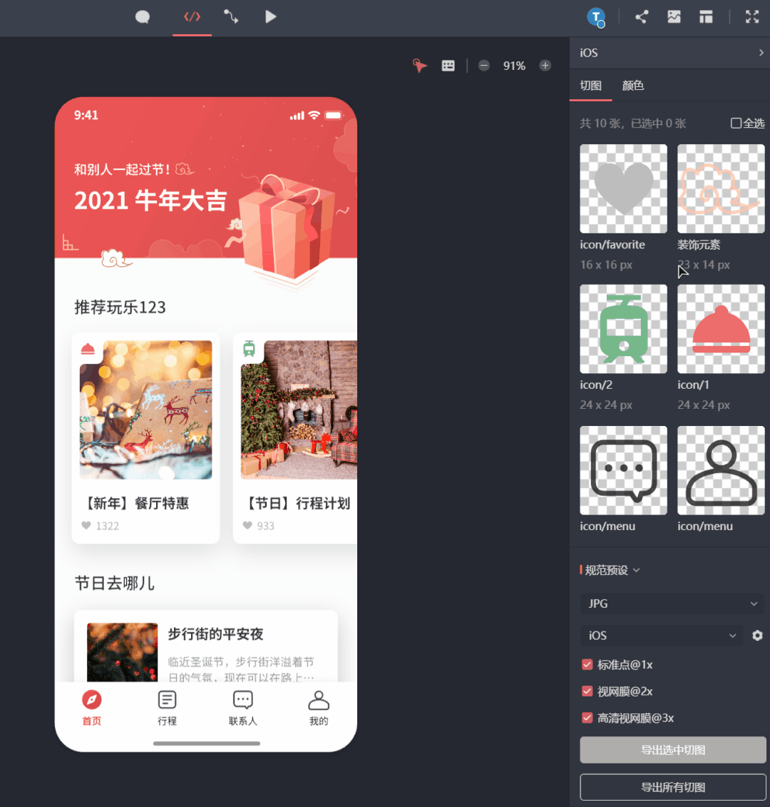 在研发预览模式中,开发人员可以随时自行切图并导出,设计师交付时只需要添加一次切图标记,即使有所遗漏或者后续修改了内容,开发自己也能搞定,不必每次都要让设计重新添加标记上传文件。