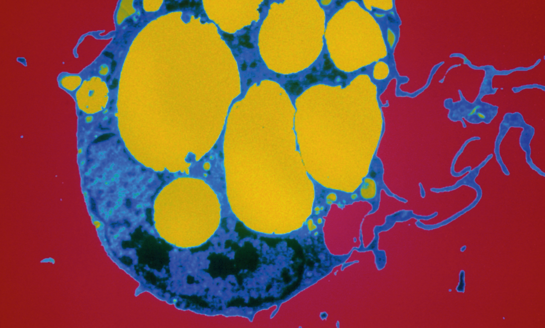 一个巨噬细胞(图中蓝色和黑色部分)正在攻击过度膨胀的脂肪细胞(图中黄色部分)