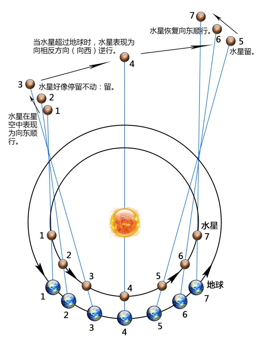 综合这一点和观察角度的变化,地球和水星从位置1运行到位置3的这段时期,在地球上的人们看来,夜空中的水星从西向东发生顺行;