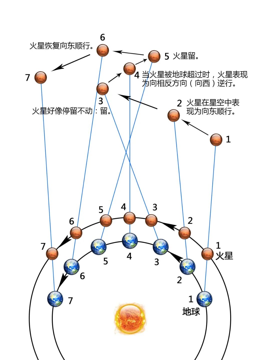 从位置3到位置5,就类似超车时的情况,地球追赶上火星并超过了它,这时在地球上看上去,火星出现了“逆行”;