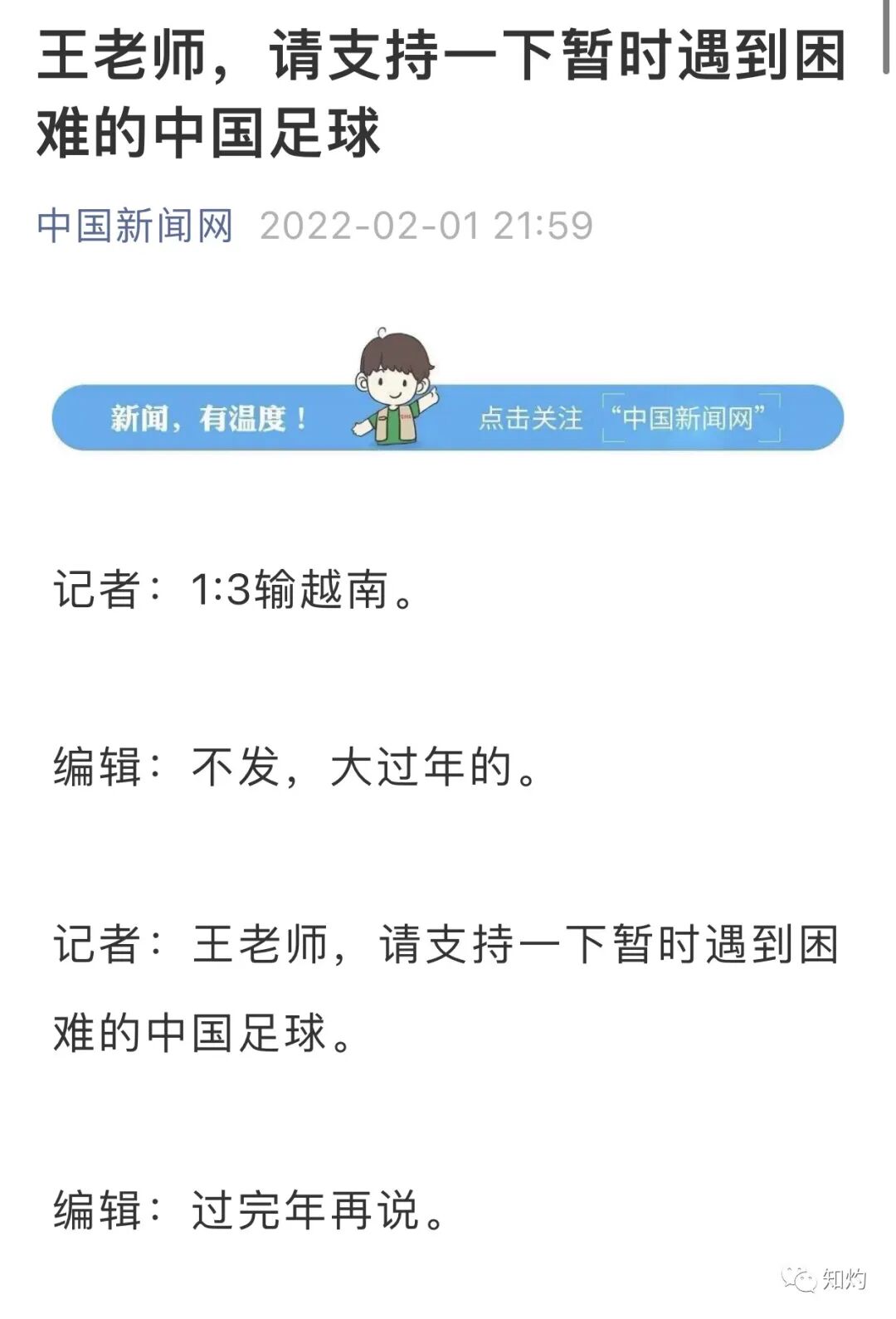 消息传出后,中国新闻社(网)发了一条新闻调侃国足,文章很短: