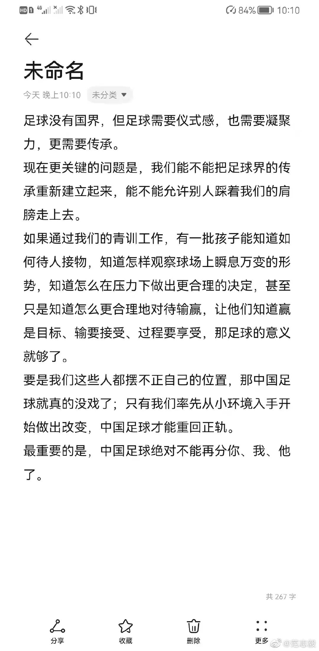 比赛结束后,范志毅在其个人微博上写道:“足球没有国界,但足球需要仪式感,也需要凝聚力,更需要传承。