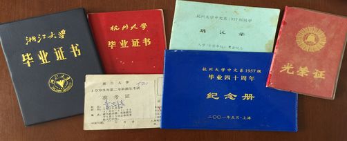 韦思浩是原杭州大学(现浙江大学)1957级的学生,就读于中文系。因为家人的缘故,曾回老家工作,有过“弃笔从农”的经历,但他从未放弃过书本,58岁时还取得了浙江大学专科教育毕业证书。图丨韦老一直珍藏着原杭州大学、浙江大学毕业证、杭州大学通讯录、纪念册等