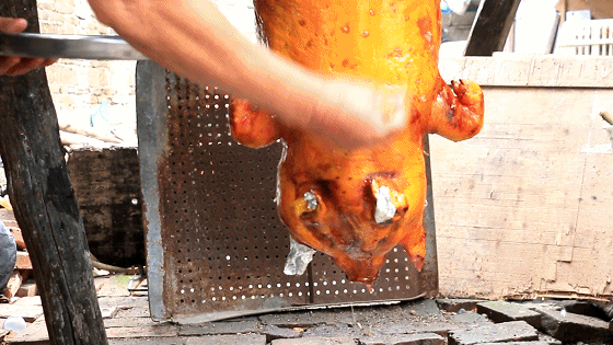 为什么是“焗”?看到了吗?这个砖砌的窑子里面已经放好木柴,猪用酱料腌入味后,把木柴烧成碳,再用铁钩把猪挂在窑子里,盖严,焗上大约1个小时左右,便可出炉,一切做法都非常原始、古朴。