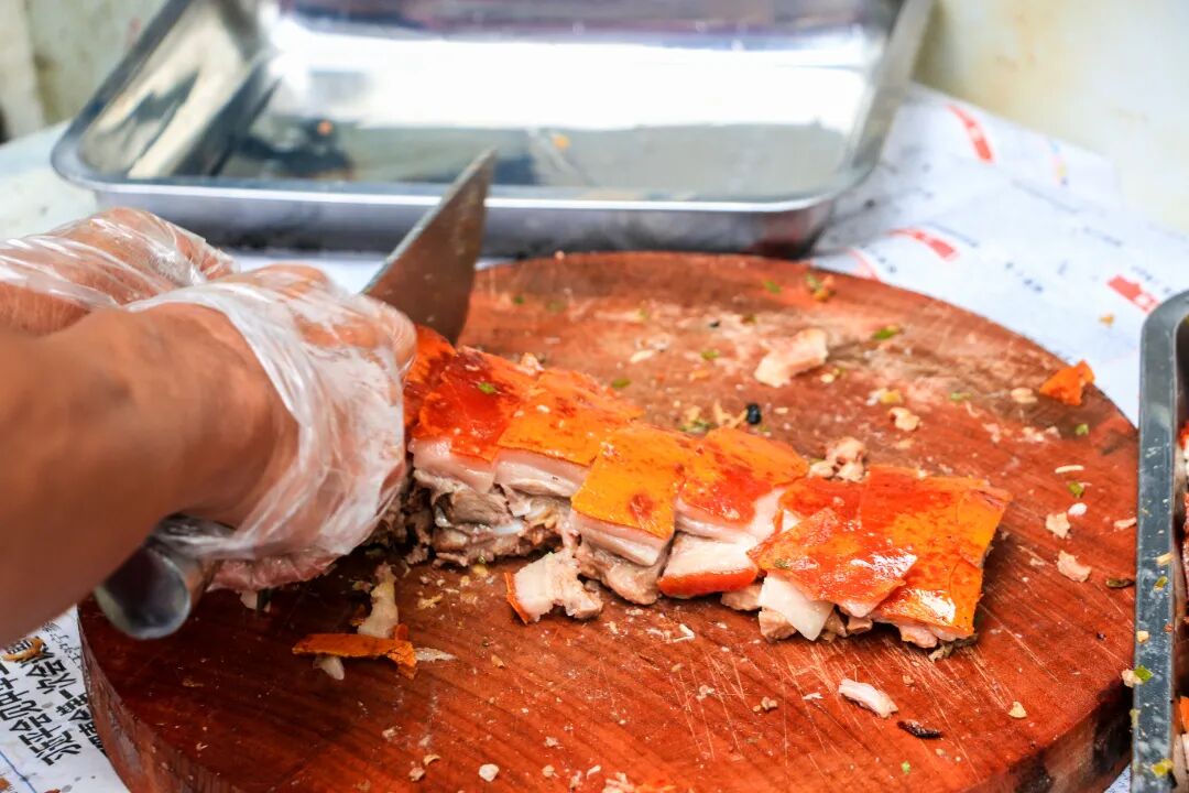 焗猪终于出炉了,焦黄油亮的色泽,散发着阵阵鲜香,令人垂涎欲滴。王坚师傅操刀剁肉,引来众人围观。