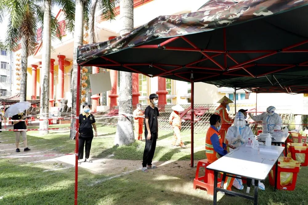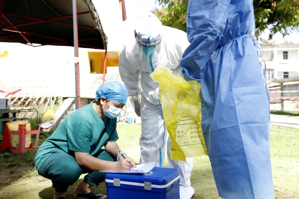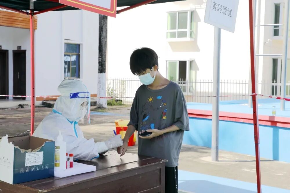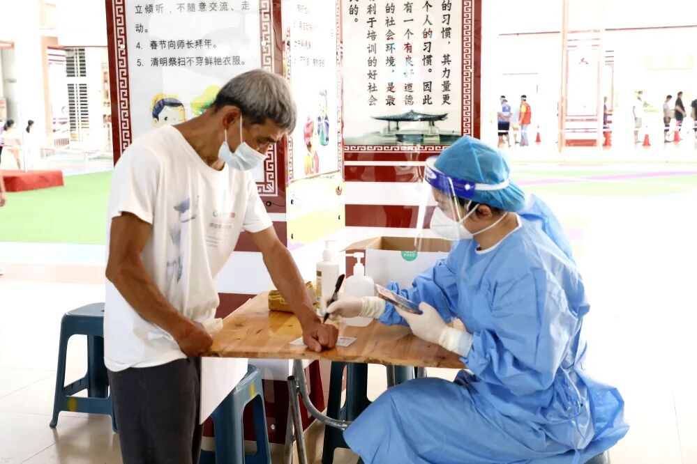 ▲8月7日,海棠区新时代文明实践志愿者引导村民按秩序做核酸,并做好现场消毒工作。