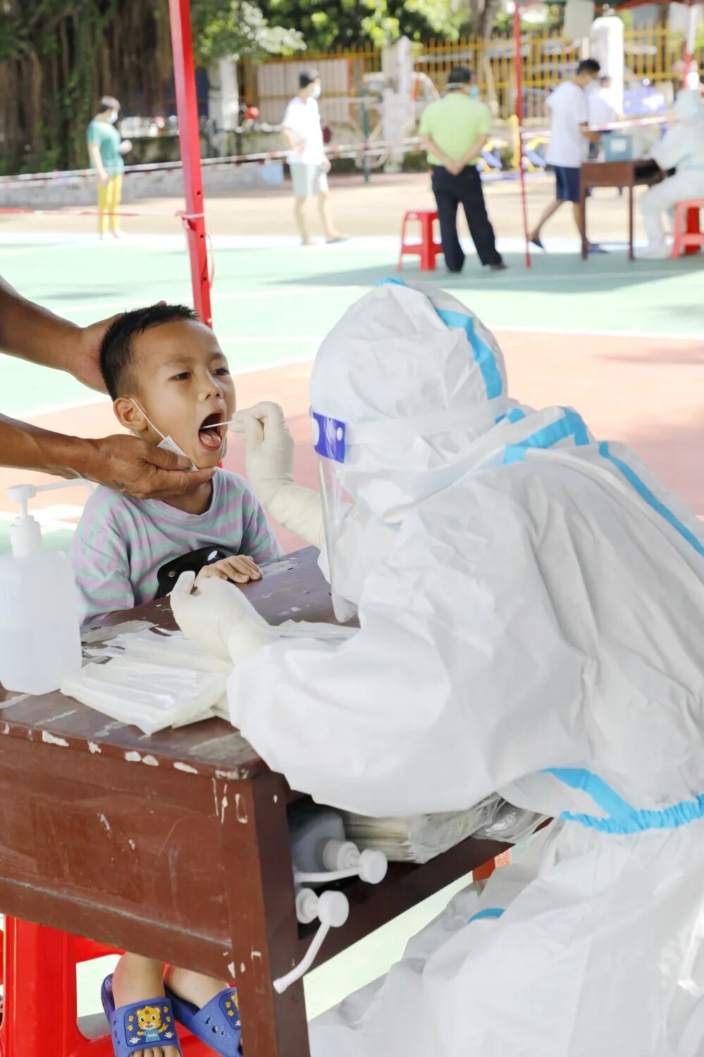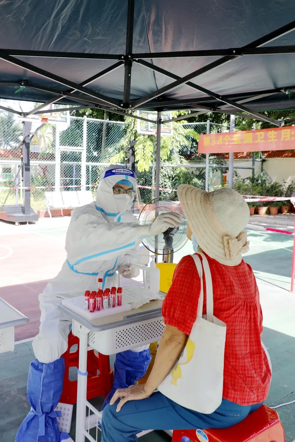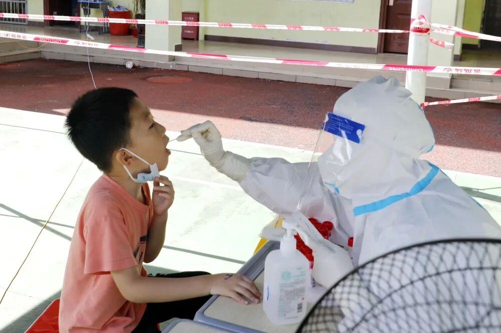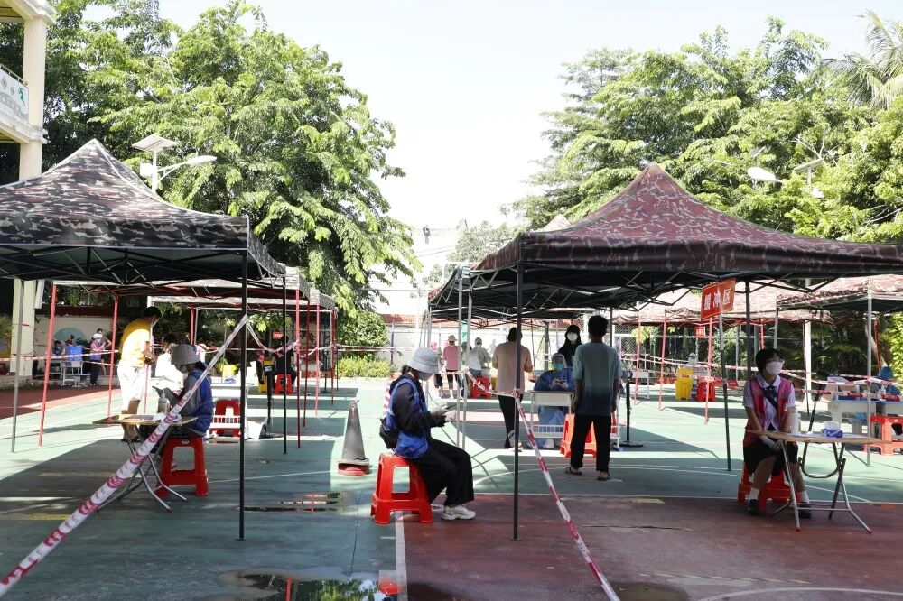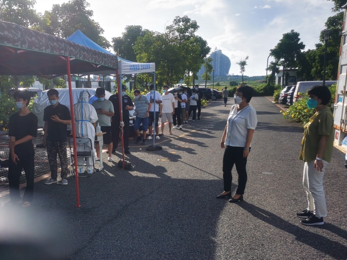 ▲8月7日,区人大常委会主任陈玮在藤海社区检查指导核酸检测工作。