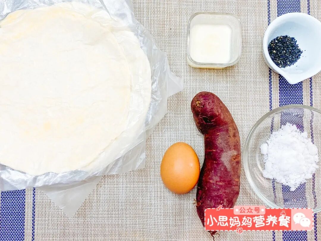 准备食材:手抓饼2张、紫薯1个、白糖15克、牛奶15毫升、鸡蛋1个、黑芝麻适量