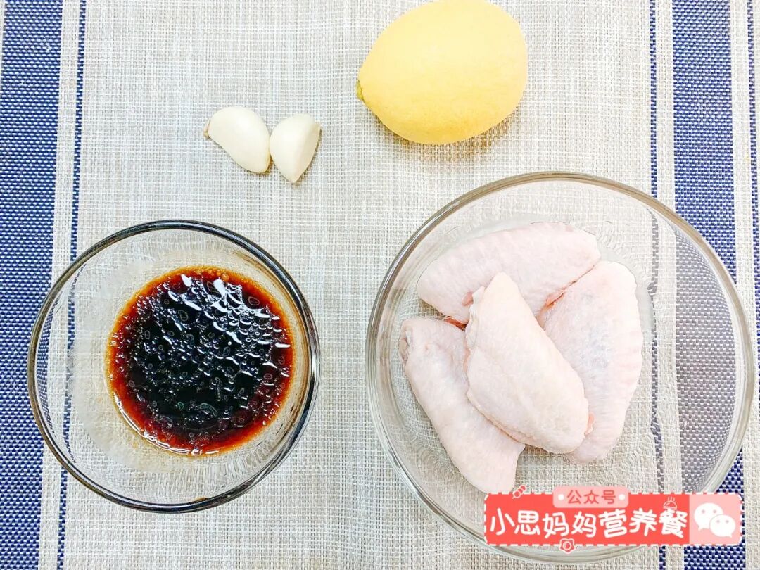 准备食材:柠檬少许、鸡翅4个、蒜适量,腌料(酱油2勺、蚝油1勺、蜂蜜1勺、油1勺)