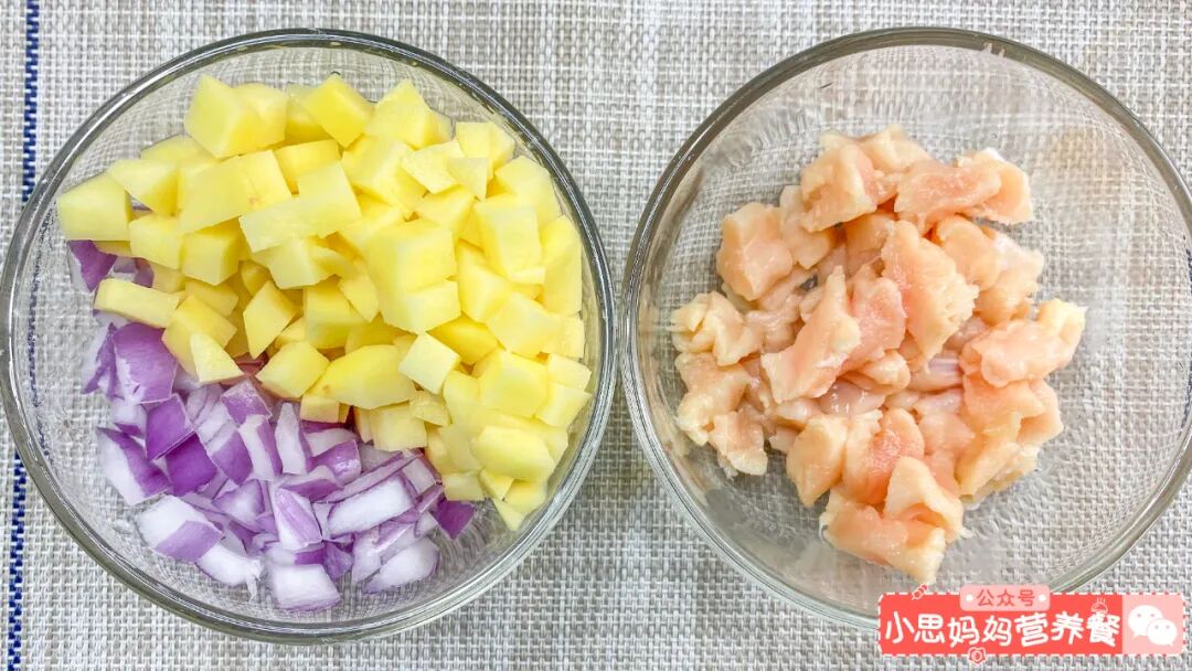土豆、洋葱、鸡胸肉切成小丁。