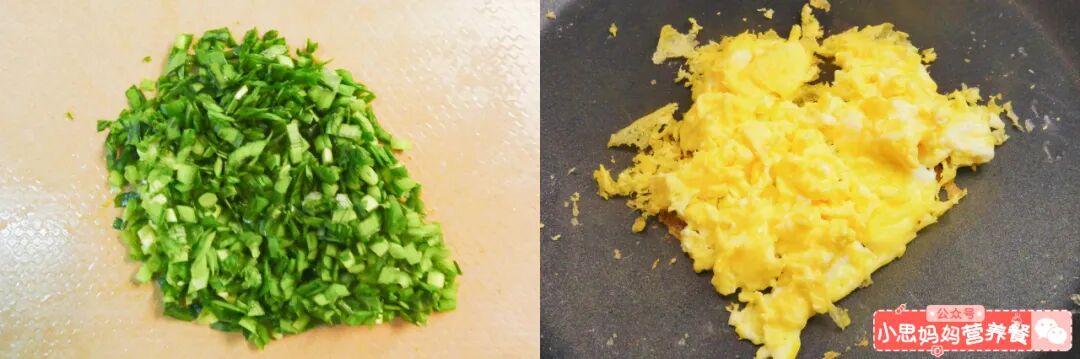 趁着发酵的时间,先来做馅料,鸡蛋打散,炒熟,韭菜切碎末。