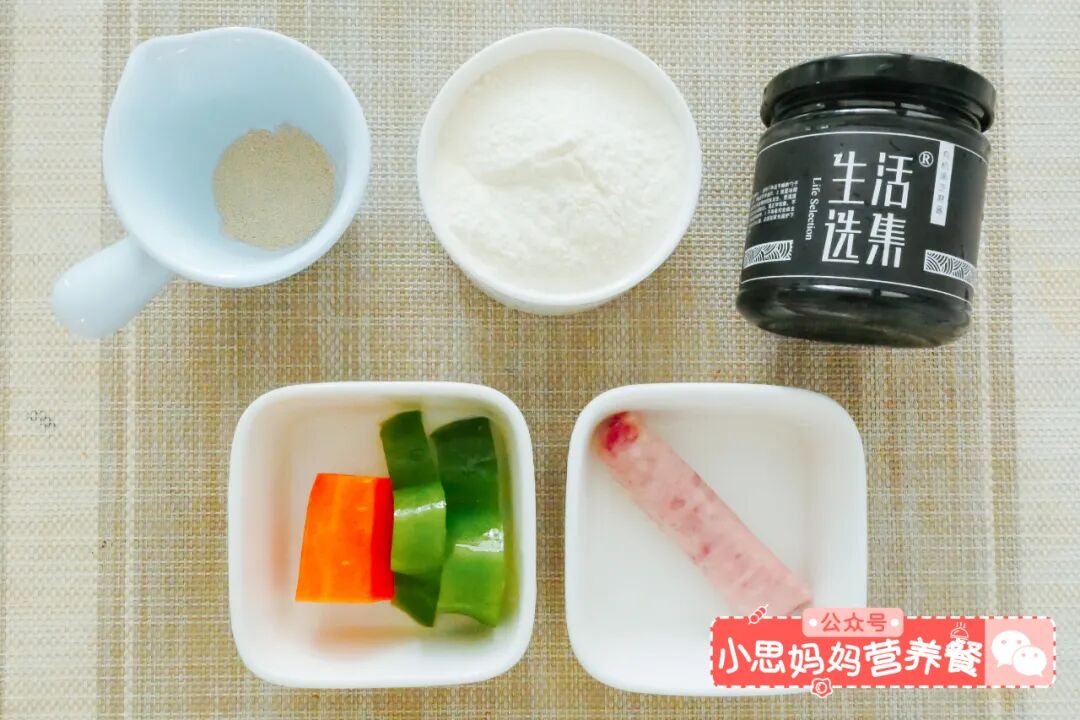 准备食材:普通面粉100克、酵母1克、肉肠1根、胡萝卜15克、彩椒15克、黑芝麻酱20克。
