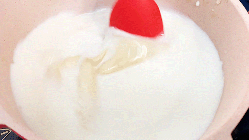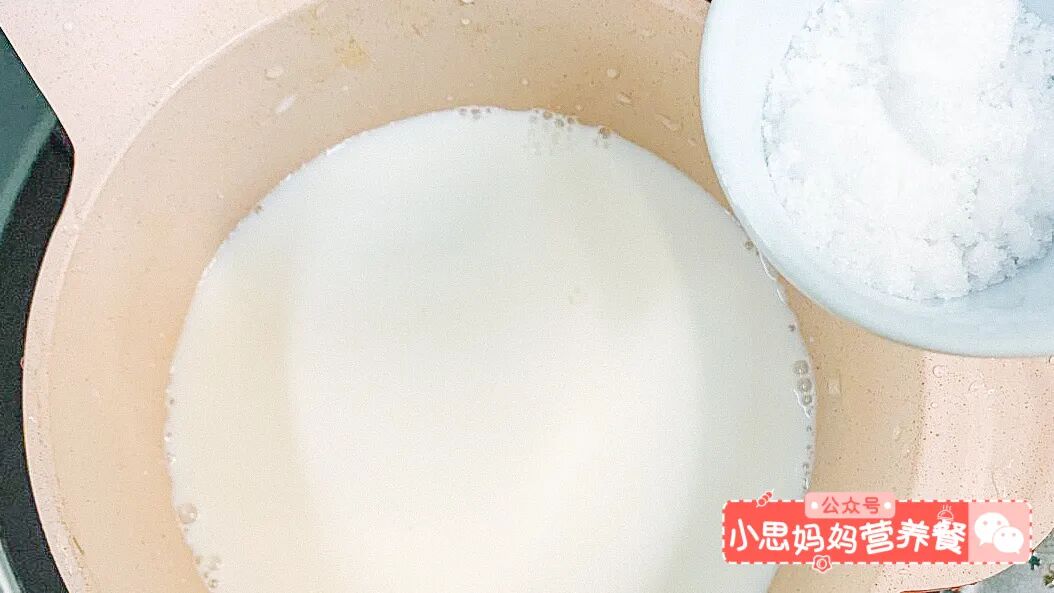 换另一个锅,250毫升牛奶加20克糖小火搅拌。