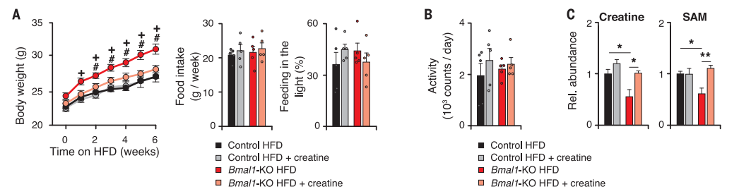 上述的数据表明,脂肪细胞生物钟可能影响生物能量转录因子的激活或依赖于肌酸代谢激活。为了研究在脂肪细胞缺乏核心时钟激活因子 Bmal1 的小鼠中增加肌酸的丰度是否可以恢复饮食诱导的脂肪产热作用。他们对 Bmal1-KO 和对照组小鼠补充肌酸,结果发现肌酸的补充在很大程度上抑制了体重的增加,恢复了葡萄糖稳态的损失。