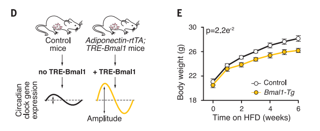 这一结果表明,放大脂肪细胞的核心时钟节律可以增加机体的能量消耗,减少体重增加。