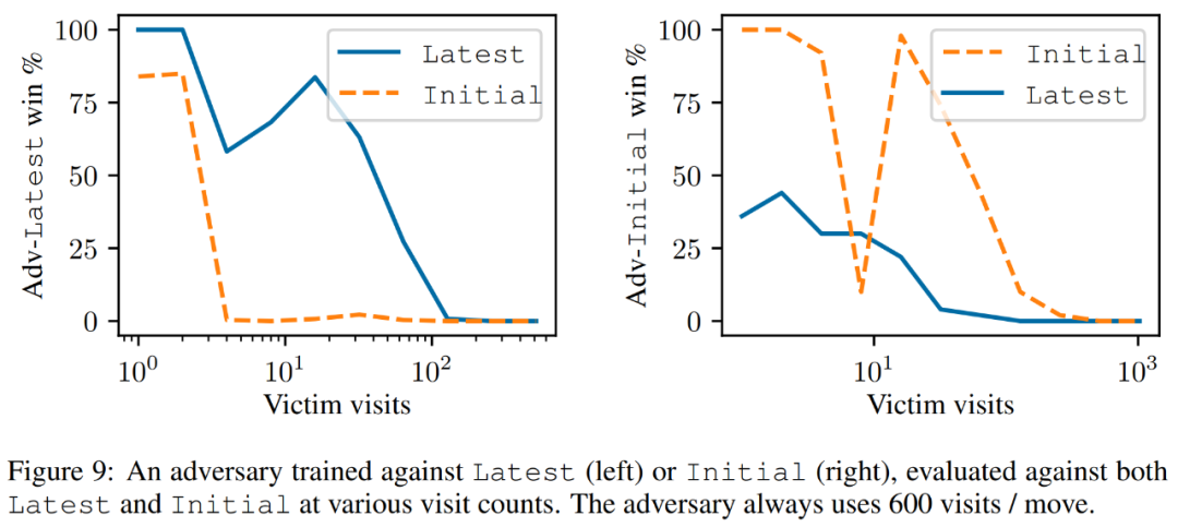 如下图 9 所示,研究者发现,尽管 Latest 是一个更强大的智能体,但针对 Latest 训练的攻击者在对抗 Latest 时要比 Initial 表现更好。