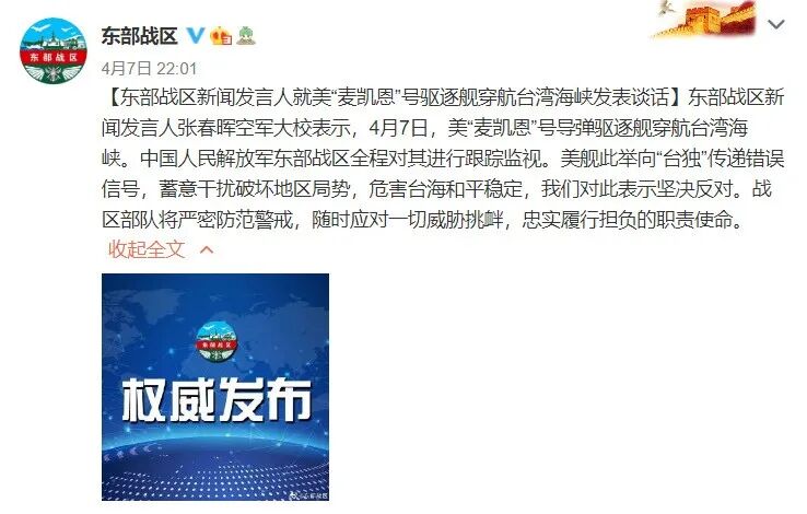 东部战区新闻发言人张春晖空军大校表示,4月7日,美“麦凯恩”号导弹驱逐舰穿航台湾海峡。中国人民解放军东部战区全程对其进行跟踪监视。美舰此举向“台独”传递错误信号,蓄意干扰破坏地区局势,危害台海和平稳定,我们对此表示坚决反对。战区部队将严密防范警戒,随时应对一切威胁挑衅,忠实履行担负的职责使命。