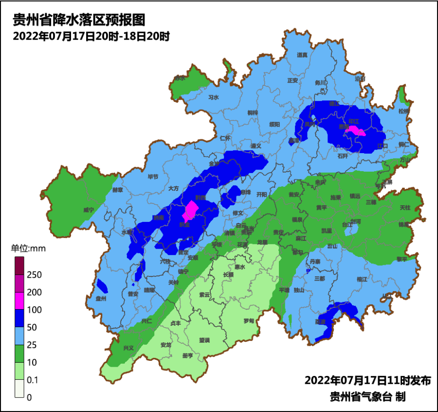 今天夜间到明天白天,暴雨主要在毕节市东部和南部、遵义市南部和东部、铜仁市中部、安顺市北部、贵阳市西部和北部,个别乡镇有大暴雨,另外省的东南部地区有分散暴雨;