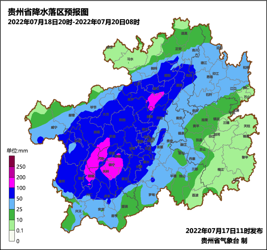 今天夜间到周一(18日)白天,全省阴天间多云有阵雨或雷雨,局地伴有短时强降水、雷雨大风等强对流天气,西部、北部及东南部有大雨,暴雨主要在毕节市东部和南部、遵义市南部和东部、铜仁市中部、安顺市北部、贵阳市西部和北部,个别乡镇有大暴雨,另外省的东南部地区有分散暴雨;