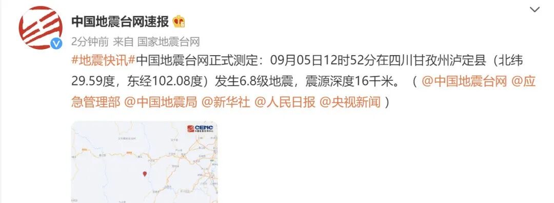 突发!四川泸定发生6.8级地震