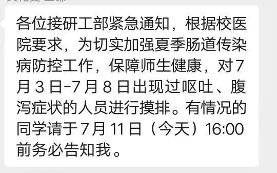 11日下午,有武大学生向媒体表示,当天下午收到了一则通知:接研工部紧急通知,根据校医院要求,为切实加强夏季肠道传染病防控工作,保障师生健康,对7月3日~7月8日出现过呕吐、腹泻症状的人员进行摸排。有情况的同学请于7月11日(今天)16:00前务必告知。