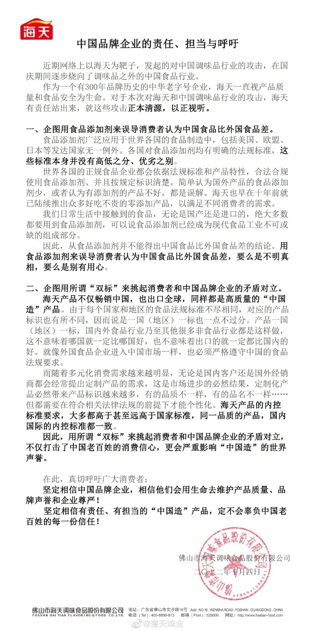 10月4日晚,海天味业官方微博发布声明《中国品牌企业的责任、担当与呼吁》,再度回应近期愈演愈烈的国内外产品“双标”争议。