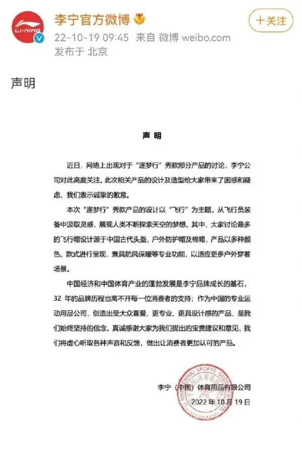 此前李宁相关高管电商总经理冯晔在朋友圈称,这是笠型盔,来源于中国古代文化。他贴出古代笠型盔帽子的图片,并表示,“我们的消费者,对于中国文化的沉淀,教育知识的传承还是少了……”李宁集团执行董事、非凡中国体育CEO李麒麟则在微博上连发五张图,分别是类似帽子设计的图片,但他随后删除了该微博。然而消费者并不认同这样的回复和解释,很多网友认为李宁方面暗讽消费者和网友没文化,这让人难以接受。还有网友替李宁着急,认为企业没有维护好李宁这个品牌。10月19日,针对近日网络上出现对于“逐梦行”秀款部分产品的讨论进行回应,李宁回应蓝鲸财经记者称,此次大家讨论最多的飞行帽目前并未生产和销售,未来也不会生产和销售。