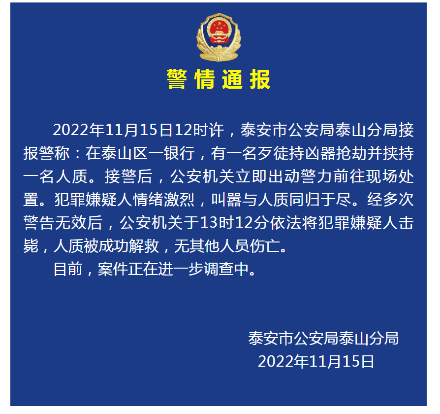 11月15日,泰安市公安局泰山分局微信公众号发布警情通报,2022年11月15日12时许,泰安市公安局泰山分局接报警称:在泰山区一银行,有一名歹徒持凶器抢劫并挟持一名人质。接警后,公安机关立即出动警力前往现场处置。犯罪嫌疑人情绪激烈,叫嚣与人质同归于尽。经多次警告无效后,公安机关于13时12分依法将犯罪嫌疑人击毙,人质被成功解救,无其他人员伤亡。
