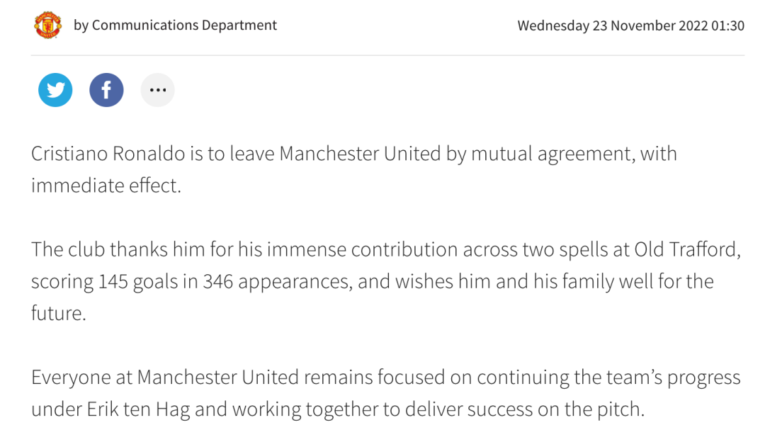 随后,C罗发表声明说:“在与曼联沟通之后,我们共同决定早些结束合同。我爱曼联,爱那里的球迷,这一切永远不会改变。然而,我觉得这是我寻求新挑战的恰当时机。预祝球队本赛季以及未来收获成功。”
