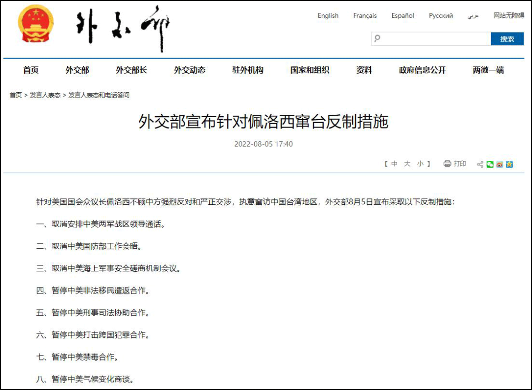 八月初,佩洛西窜台事件发生后,中方随即对美打出重拳,宣布了八项反制措施,包括三个“取消”和五个“暂停”。