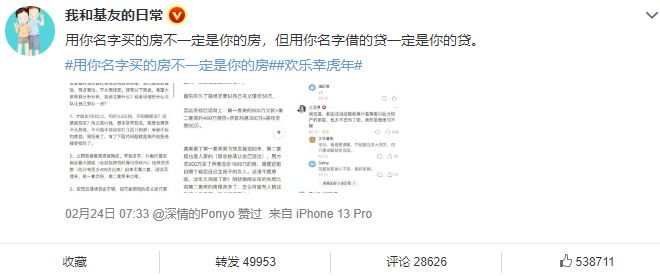 她和对象还没领证见父母,对象和他父亲打算全款买房,出资五百万写女孩的名字。理由是男方没有社保,无购房资格,而未来公公名下有房,二套房税费太高,不划算。但是,房子买完后,男方打算全款抵押贷款给银行,贷出四百万出来,买第二套房。还有,买完这两套房之后,男方家里没钱装修,还将继续以女孩的名义进行装修贷贷款,加起来也要小几十万。一开始,网友都觉得女孩在凡尔赛,白赚一套房的好事还要犹豫?赶紧答应啊。如果未来离婚,男方出的那五百万,可以通过资金来源追回。用女孩名下的房产进行抵押借贷的四百万现金买第二套房,大概率不会再写女孩名字,但债务却实实在在是女孩的。至此,除去最初的五百万购房款,女孩至少已经背上了400万借贷+高额贷款利息+装修贷……一旦出事,男方可以用“合法手段”夺回两套房大赚一笔,女方则会被彻底打入万劫不复之地。擦亮眼睛,好好识人,永远不要用真心去赌对方的人品。相处大半年,感情不错,但却有一个地方令人很不自在:男友和父母同住,每晚有十点半的门禁时间,特殊情况下,才可以延迟到十一点。有年正月初六,她坐末班车从老家回杭州,十点多到黄龙站,人仍然很多,打车需要等五十多分钟,出租车也拦不到。附近没有地铁站,她拖了很大的行李箱,无奈之下给男友发了信息,截图了打车等待的时间。“要这么久啊?要么你去旁边的肯德基麦当劳坐下来等吧,你自己注意安全。”