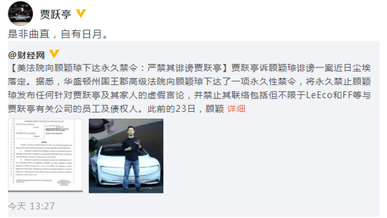 贾跃亭胜诉之后,当时还在微博上转发了这条新闻,并且说:“是非曲直,自有日月。”