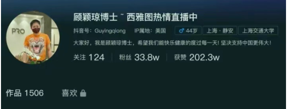 不光是IP属地在美国,就连名字也改成了“顾颖琼博士~西雅图热情直播中”。